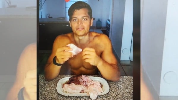 Como lees, Fusco promueve el consumo de un almuerzo “cien por ciento carnívoro crudo”. Al que hay que acompañar de su respectiva leche de cabra y una porción de mantarraya, todo totalmente crudo.