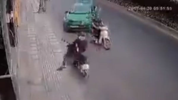 Cámaras de videovigilancia captaron el momento en que un motociclista en movimiento le arrebató el bolso a una mujer, y metros después un taxista que vio el hecho arrolló al delincuente.