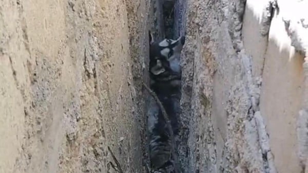 La usuaria de TikTok @roblesziraika grabó el momento justo en el que se ve a un perrito husky atrapado entre ambos muros, sin ninguna posibilidad de salir por sí mismo debido a lo estrecho del espacio entre las dos bardas.
