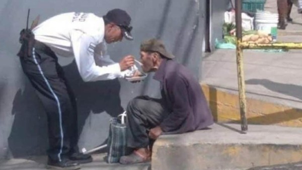 Nestor Castillo, un usuario de Facebook, compartió una bella imagen en la que se ve a un guardia de seguridad alimentando a una persona de la tercera edad en situación de calle.El elemento se agachó para ayudarle con la cuchara al viejito y que pudiera comer.Tras hacerse viral, muchos usuarios han reconocido el gran gesto que tuvo el policía con el señor. Y piden a las demás personas también ser empáticos y ayudar a los que más lo necesitan.“Digno de admirar y de imitar, todavía existen buenas personas en este mundo”, comentaron.*EHL/n