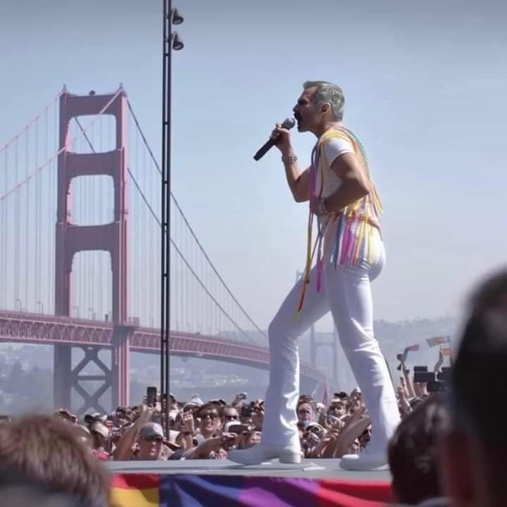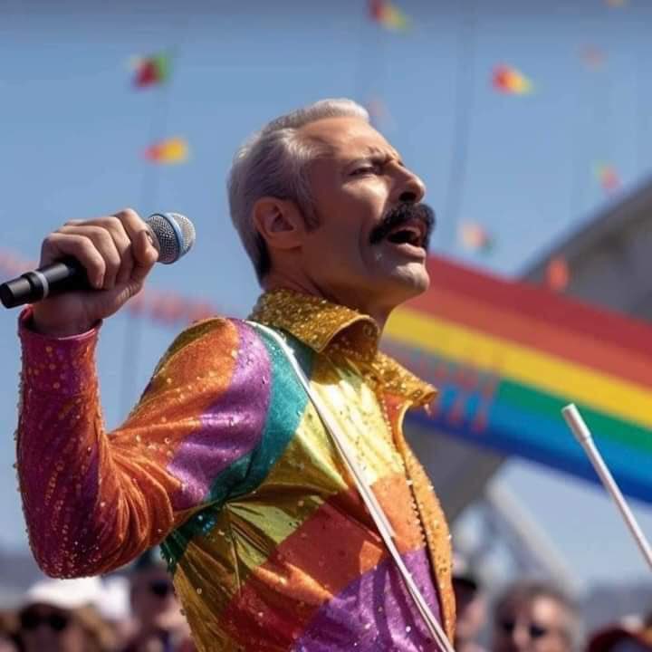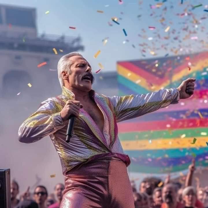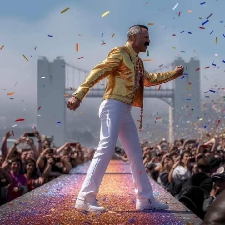 En esta ocasión le tocó al cantante Freddie Mercury, líder del grupo Queen y quien falleció en 1991. Pero gracias a la IA, podemos darnos una idea de cómo se vería a los 77 años. Las imágenes que han circulado recientemente en redes sociales, se puede ver a Freddy presentándose en un concierto del PRIDE, vistiendo su icónica chamarra dorada y un pantalón blanco.