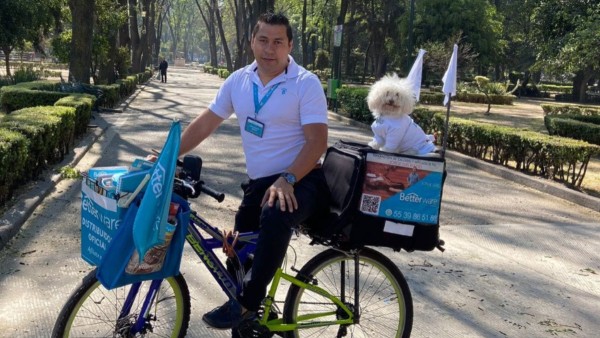 En las redes sociales ya ronda la foto de Osito, un perrito de blanco pelaje que contrasta muchísimo con su uniforme azul Betterware, que incluye gorrita.