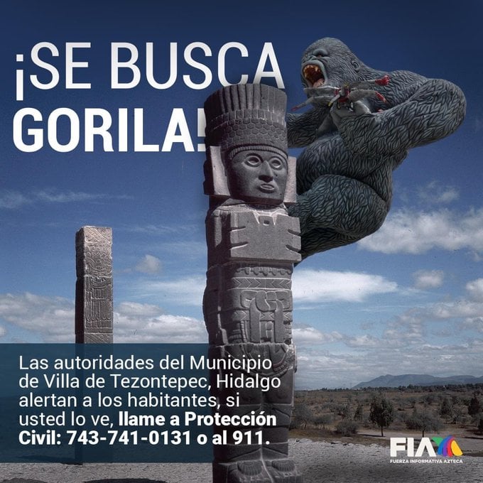 ¿Lo has visto? En la página oficial del gobierno de Villa de Tezontepec, Hidalgo, piden a la ciudadanía informes sobre un gorila perdido, de origen desconocido, y la publicación ya se hizo viral.