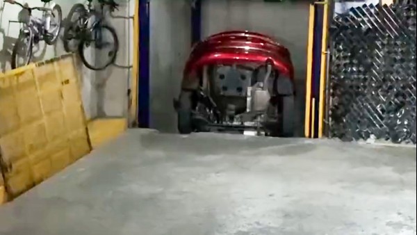 Un video del momento, compartido en redes sociales, muestra cómo el auto particular color rojo quedó parcialmente dentro del cubo del elevador.