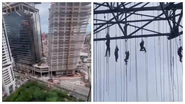 En un video que circula en redes sociales, se puede ver los andamios derribados en el suelo, mientras los obreros se aferran a los cables de seguridad.