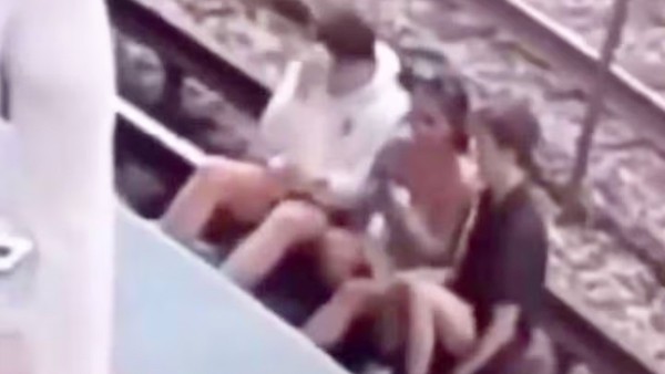 El video termina cuando un tercer acompañante se da cuenta de la situación y jala a los dos jóvenes, separándolos de las vías.
