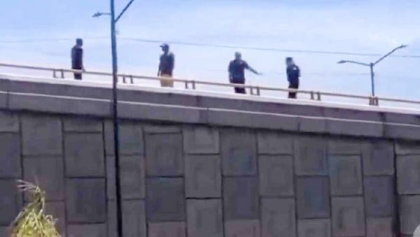 En las imágenes se observa cómo un hombre amenaza con lanzarse desde el puente vehcular, mientras otra persona intenta convencerlo de que no lo haga. Al mismo tiempo, dos policías se acercan a ellos para evitar que el sujeto se lance.