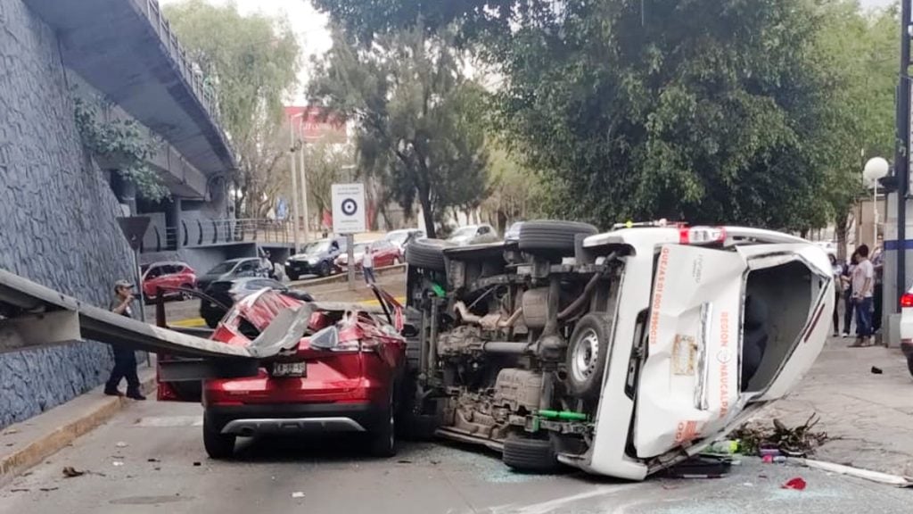 Naucalpan, Estado de México - Una combi del transporte público perdió el control y cayó desde la lateral del segundo piso del periférico sobre una camioneta que circulaba debajo, hecho que dejó al menos dos personas heridas.