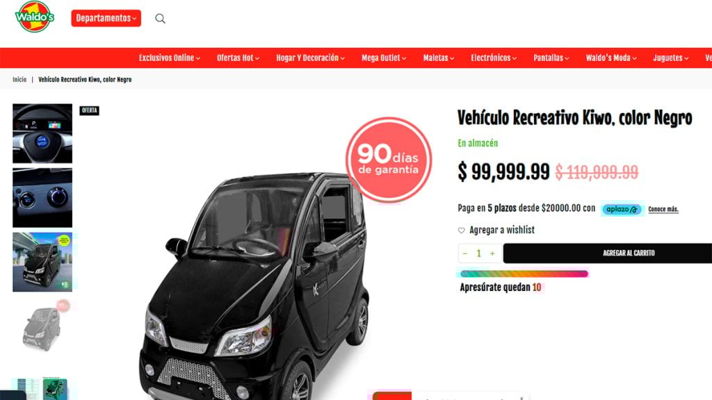 Después de conocer las características del auto eléctrico que vende Waldo’s, seguramente te interese su precio, el cual es de $119,999.99 pesos. Sin embargo, la tienda tiene una oferta en la que puedes adquirirlo por tan solo $99,999.99 pesos.