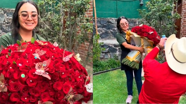 En el clip, se observa a Paola recibiendo el enorme arreglo mientras el repartidor explica que fue enviado por su pareja, quien aseguró estar "muy arrepentido" y dispuesto a cambiar por el amor que le tiene.