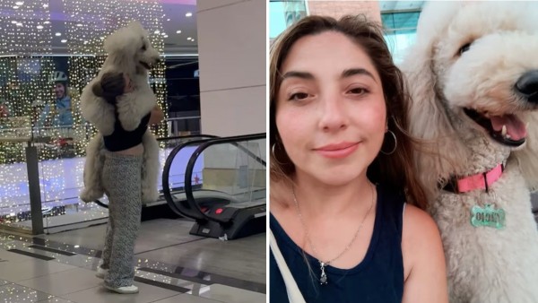 Un influencer argentino, Tomás Weiss (@weisstomi), grabó un momento insólito en un centro comercial de Santiago de Chile, donde una mujer cargó a su perra gigante por las escaleras mecánicas.