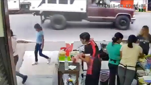 Las imágenes del incidente muestran el momento en que una mujer de cabello rubio teñido y vestida con una playera gris con letras blancas se acerca al puesto, donde se observan a tres mujeres que atienden a los comensales.