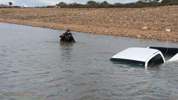 El personal de rescate acuático ingresó a la presa para iniciar la búsqueda. A unos dos metros de profundidad lograron ubicar una camioneta Dodge Dakota 1997 con placas de Zacatecas.