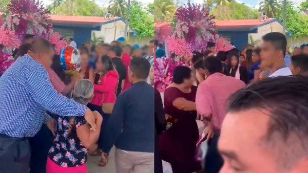 El video presentado como "Y cómo son las graduaciones en Tabasco", se observa a una mujer vestida de guinda sujetando del cabello a otra madre mientras varias personas intentan separarlas.