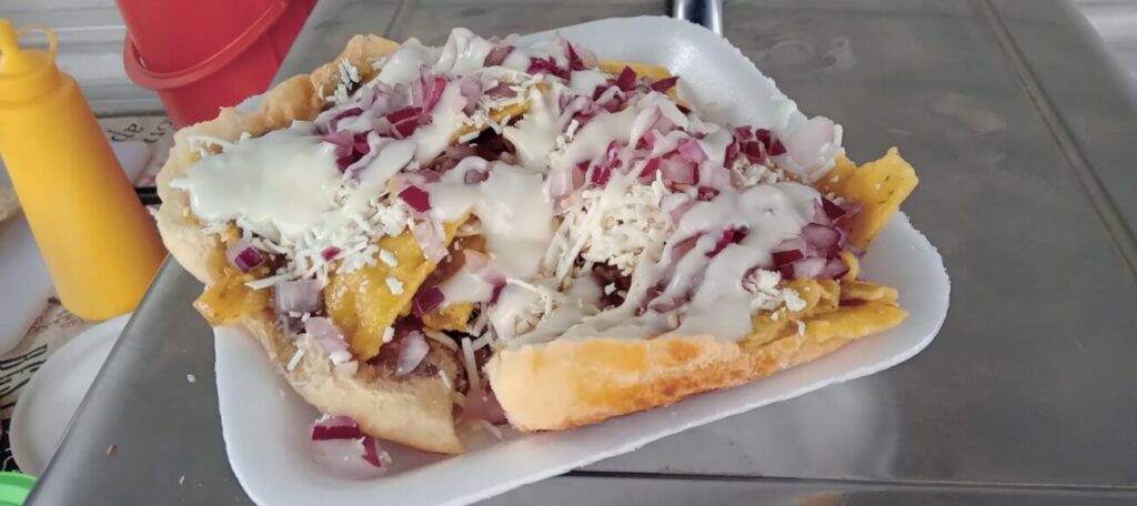 Y por si fuera poco, le agregan cebolla morada, queso y una buen ración de crema, además de que salsita al gusto para rematar.