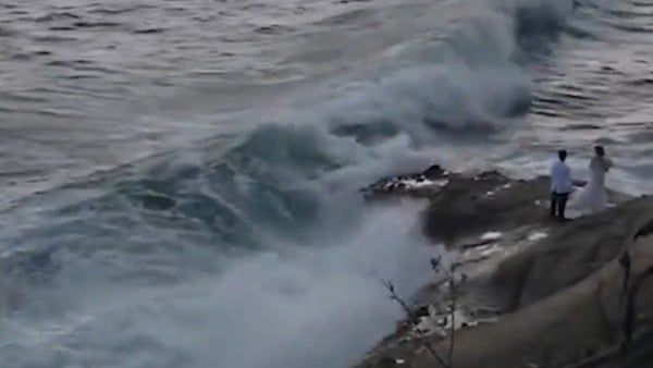 California, Estados Unidos - Una ola arrastró a una pareja al momento en que realizaban una sesión de fotos a un costado del mar.