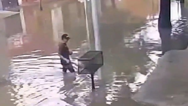 Cámaras de seguridad captaron el momento en que el adolescente, junto a su hermano y otro amigo, caminaban por la banqueta. De pronto, el menor baja a la calle inundada, y cuando intentaba subir se agarró del poste, lo que provocó una descarga eléctrica que lo derribó y lo dejó inconsciente en el agua.