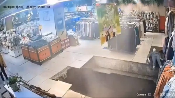 Zhenjiang, China - Un video captó el momento en el que una mujer cayó por un enorme socavón que se abrió repentinamente en el suelo de un centro comercial en la ciudad de Zhenjiang, China.