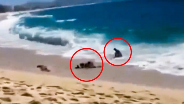 San José del Cabo, Baja California Sur - Un video que circula en redes sociales muestra el momento en que una pareja de turistas estadounidenses de la tercera edad estuvo a punto de ser arrastrada por el mar en la playa Costa Azul de San José del Cabo.