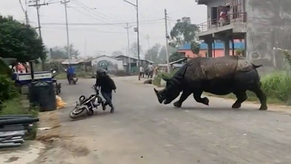 Nepal - Un rinoceronte procedente del Parque Nacional de Chitwan irrumpió en una zona urbana, e incluso arremetió contra un motociclista, aunque este alcanzó a evitar la embestida.