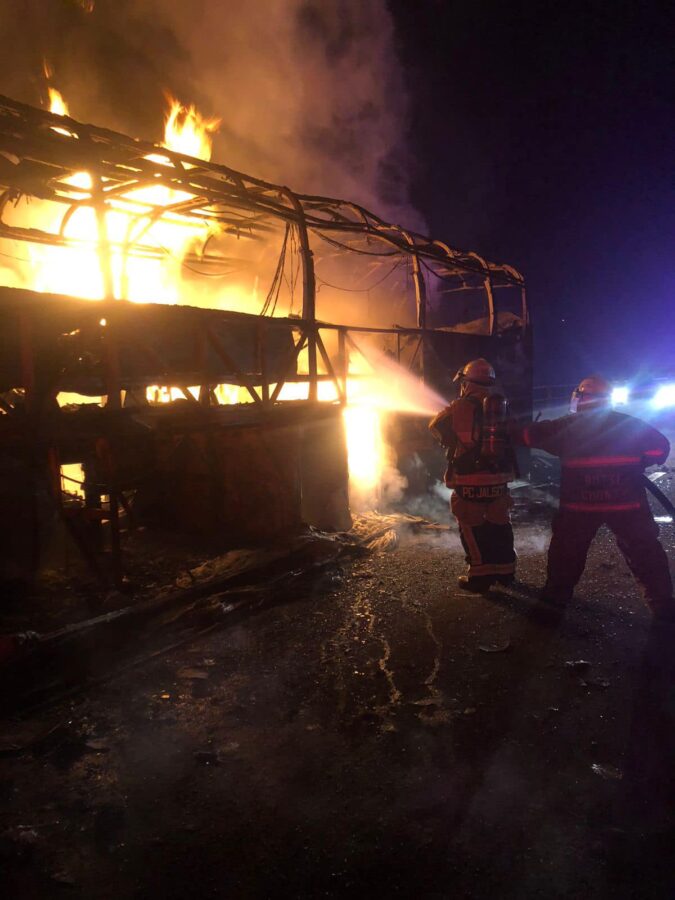 El hecho ocurrió en el kilómetro 90 de la autopista de Lagos de Moreno a Jalostotitlán, donde, por razones aún desconocidas, el autobús sufrió un accidente que a su vez ocasionó que la unidad se viera consumida por las llamas.