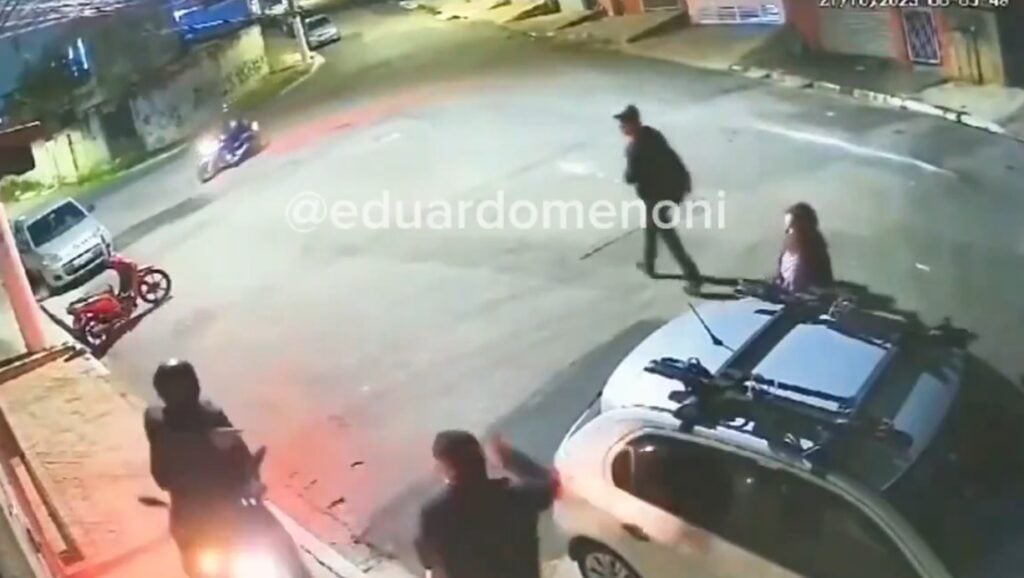 En el video se observa el momento en que una pareja baja de una camioneta y el asaltante en moto se acercó del lado del copiloto de donde descendió el hombre y le apuntó con el arma.