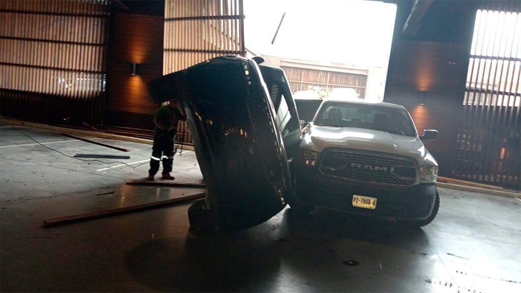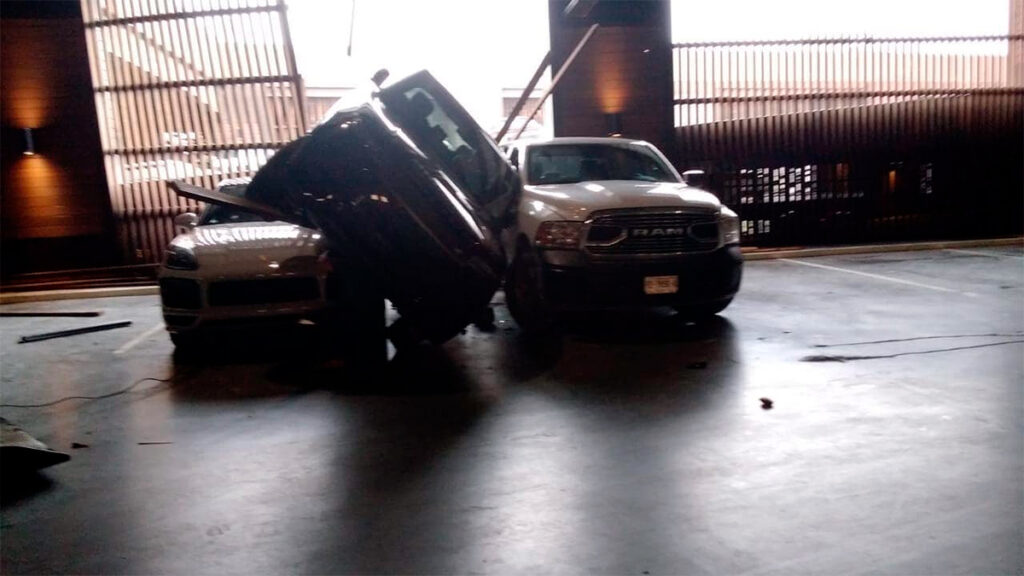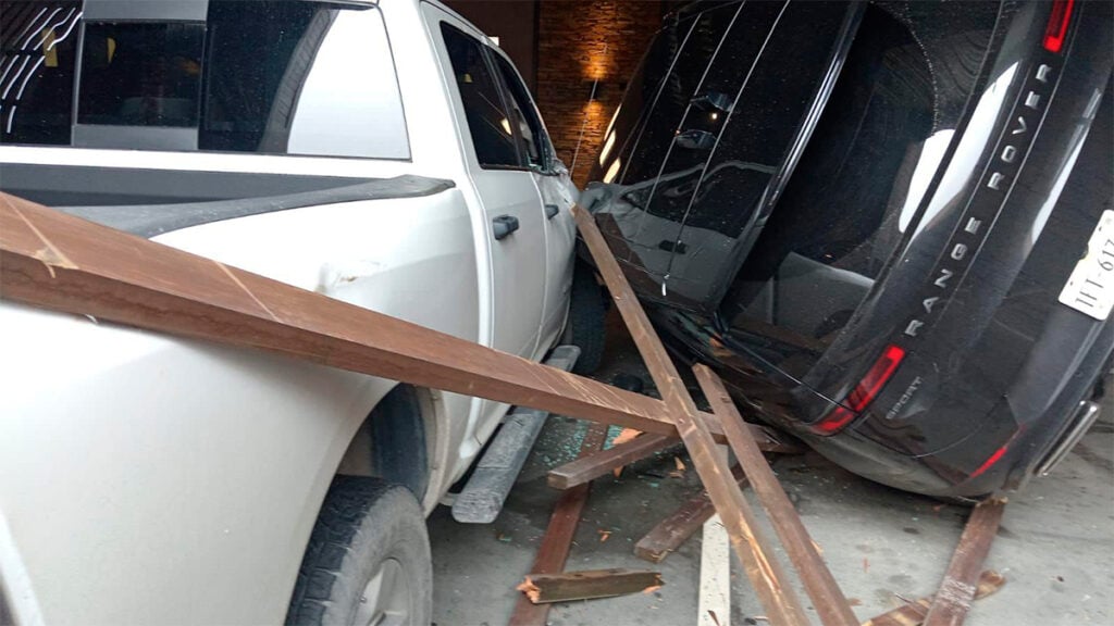 El incidente se registró alrededor de las 11 de la mañana de este jueves, cuando la conductora de la camioneta Range Rover, de color negro, perdió el control mientras se encontraba en la rampa del estacionamiento, saliendo del carril y desplomándose sobre un automóvil Porsche y una camioneta Ram, ambos en tonalidades blancas.