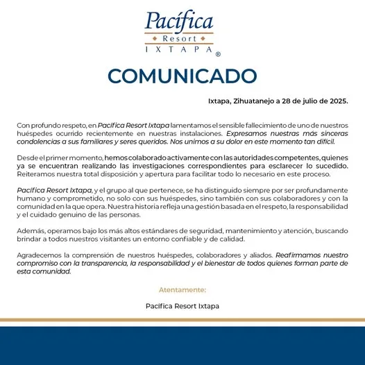 El 28 de julio, Pacífica Resort emitió un comunicado oficial, en el que lamentó el fallecimiento de Sagid y aseguró que “desde el primer momento, hemos colaborado activamente con las autoridades competentes”. También defendió sus protocolos: “Operamos bajo los más altos estándares de seguridad, mantenimiento y atención”, expresó.
