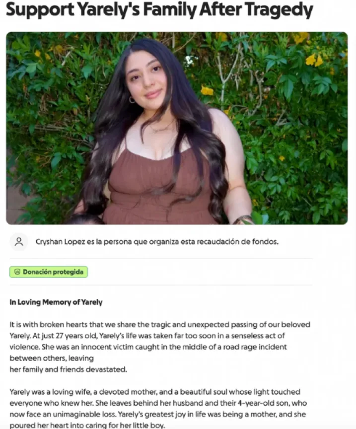 La familia de Yarely abrió una campaña en GoFundMe para cubrir gastos funerarios y brindar apoyo económico a su esposo y a su hijo pequeño.