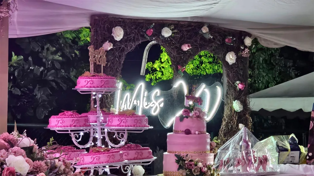 La quinceañera llegó en un automóvil clásico adornado con flores, recibió el aplauso de los asistentes y disfrutó de la actuación de 13 grupos musicales, entre ellos Charly y su Grupo Súper Amor, Meño Segovia y El Show de Pinky.