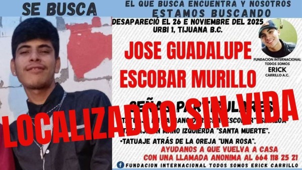 Tijuana, Baja California - Luego de ocho días de incertidumbre y búsqueda constante, José Guadalupe Escobar Murillo, de 20 años, fue encontrado sin vida por sus familiares.