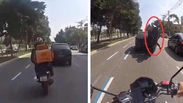 En el clip, que dura menos de medio minuto, se observa el momento en que un repartidor de comida y un automovilista protagonizan una confrontación que escala rápidamente.