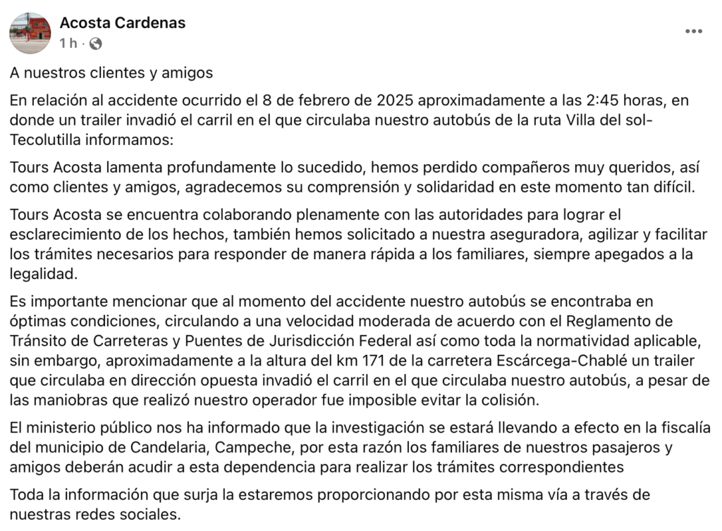 De acuerdo con los primeros reportes publicados por El Diario de Yucatán, el autobús de la empresa 'Tours Acosta' viajaba de Cancún, Quintana Roo, hacia Tabasco cuando, alrededor de la 1:00 de la mañana, el conductor del tráiler invadió el carril contrario y chocó de frente contra la unidad de pasajeros. La colisión desencadenó un incendio que consumió ambos vehículos.