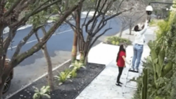 Ahí llegó Iris Liliana en su camioneta y acompañada de una empleada doméstica. En las imágenes de las cámaras de seguridad, se observa como la mujer saca unas escaleras y unas tijeras de la cajuela y procede a intentar cortar el sistema de vigilancia de la vivienda.