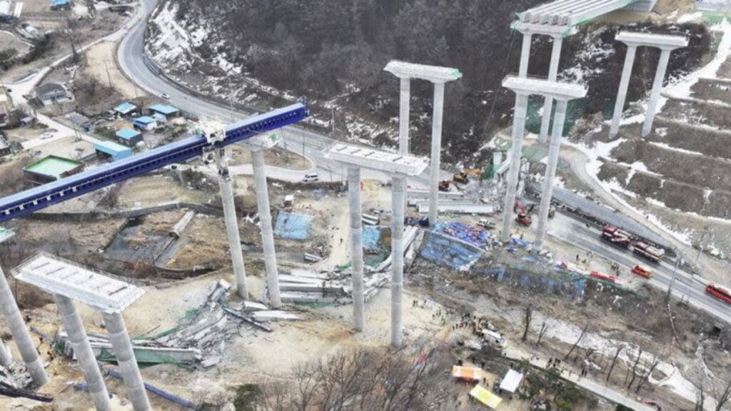 El desplome involucró cinco estructuras de acero de 50 metros de longitud, que se vinieron abajo mientras las instalaban con una grúa en un tramo de la autopista de Cheonan.