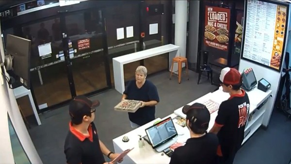 El video de los hechos, captado por la cámara de seguridad del local, muestra como la mujer discute con los empleados de la pizzería tras recibir su orden. Aunque se desconoce qué provocó la ira de la mujer, esta se ve muy molesta.