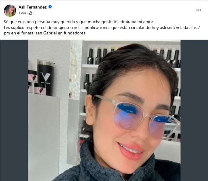 “Sé que eras una persona muy querida y que mucha gente te admiraba, mi amor. Les suplico respeten el dolor ajeno con las publicaciones que están circulando hoy. Asli será velada a las 7 pm en el funeral San Gabriel en Fundadores”, escribió el esposo.