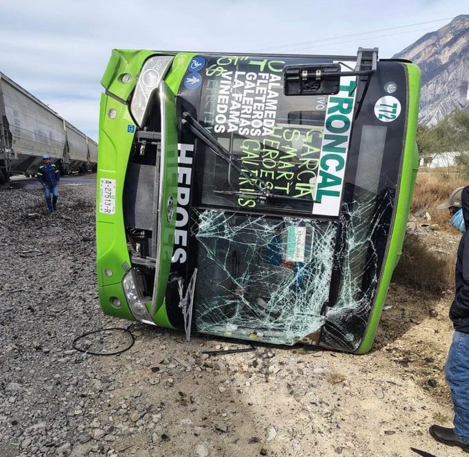 García, Nuevo León - Un camión de pasajeros fue impactado por un tren tras intentar ganarle el paso en un cruce ferroviario.
