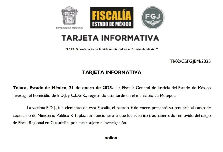 La Fiscalía mexiquense ya inició una investigación para dar con el paradero de los responsables de este doble homicidio. Las autoridades analizan las imágenes del video y recopilan testimonios para esclarecer los hechos y determinar el móvil del crimen.