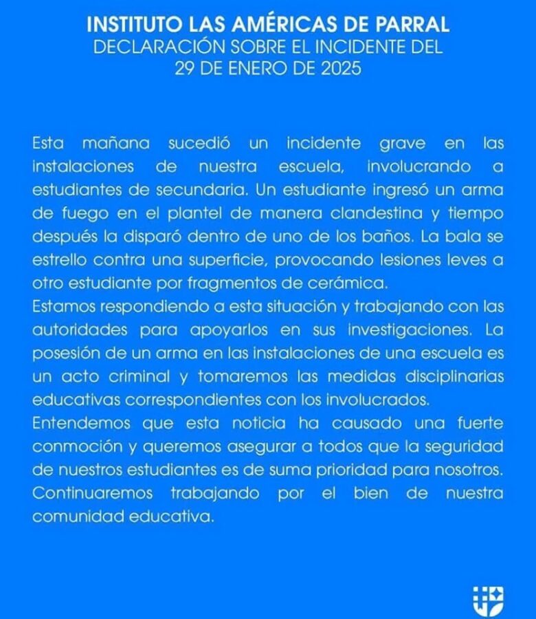 El accidente ocurrió este miércoles 29 de enero alrededor de las 11:00 de la mañana en el Instituto Las Américas, ubicado en la colonia Las Quintas, en Parral, Chihuahua.