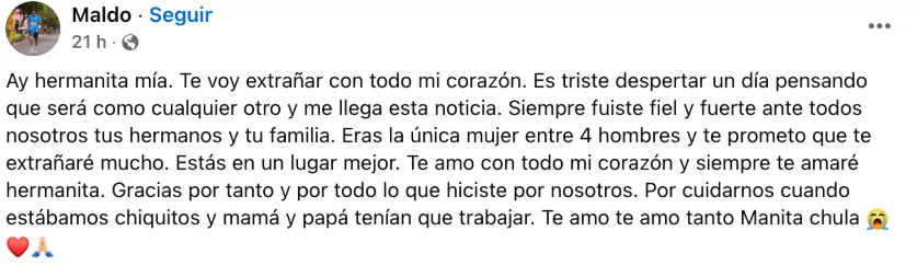 La joven, quien era la única mujer entre cuatro hermanos, fue recordada con profundo amor por su familia, especialmente por uno de sus hermanos, quien, de acuerdo al medio Debate, compartió un emotivo mensaje en redes sociales:
