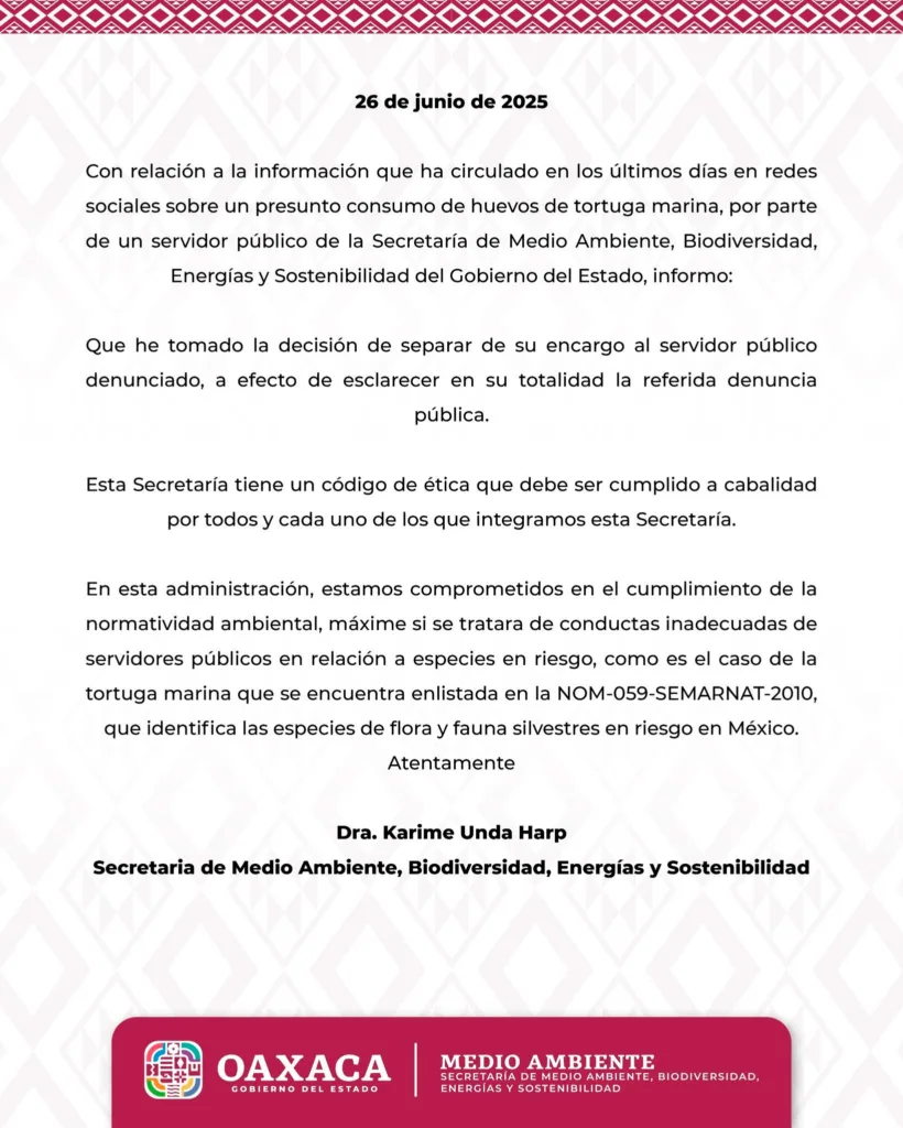 Oaxaca— La Secretaría del Medio Ambiente, Biodiversidad, Energías y Sustentabilidad del estado de Oaxaca removió de su cargo a Agustín Elías Ramírez, director de Cambio Climático, luego de que difundiera en sus redes sociales imágenes en las que se le observa consumiendo huevos de tortuga, especie catalogada en peligro de extinción.