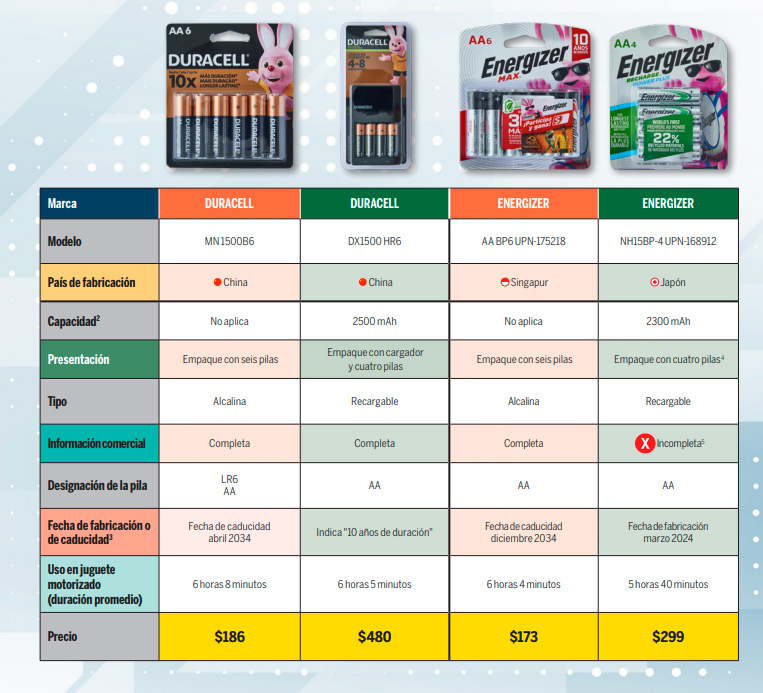 El estudio de Profeco incluyó pruebas de duración en usos típicos, marcado y etiquetado. Para evaluar su desempeño, se utilizó un juguete motorizado y se midió el tiempo de funcionamiento antes de que la batería se agotara. A continuación, los resultados obtenidos: