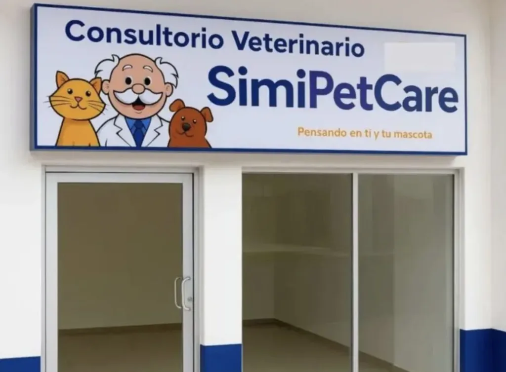 En la lona que aparece en la foto se puede ver el nombre de SimiPet Care con la ilustración de gatitos y perritos con un Dr. Simi también en caricatura.
