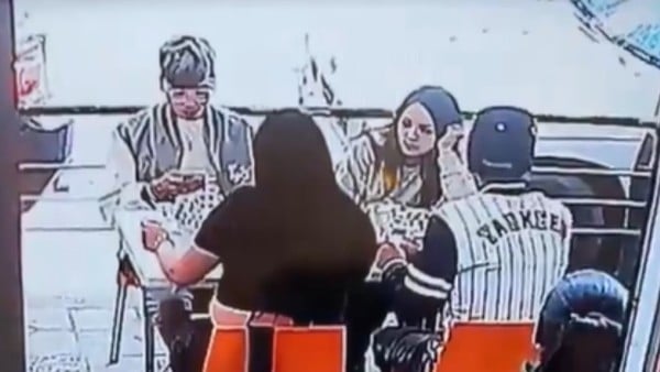 En las imágenes, que se hicieron virales en redes sociales, se observa cómo un grupo de cuatro jóvenes, dos hombres y dos mujeres, está comiendo en un restaurante, en una de las mesas que se encuentran afuera del inmueble.