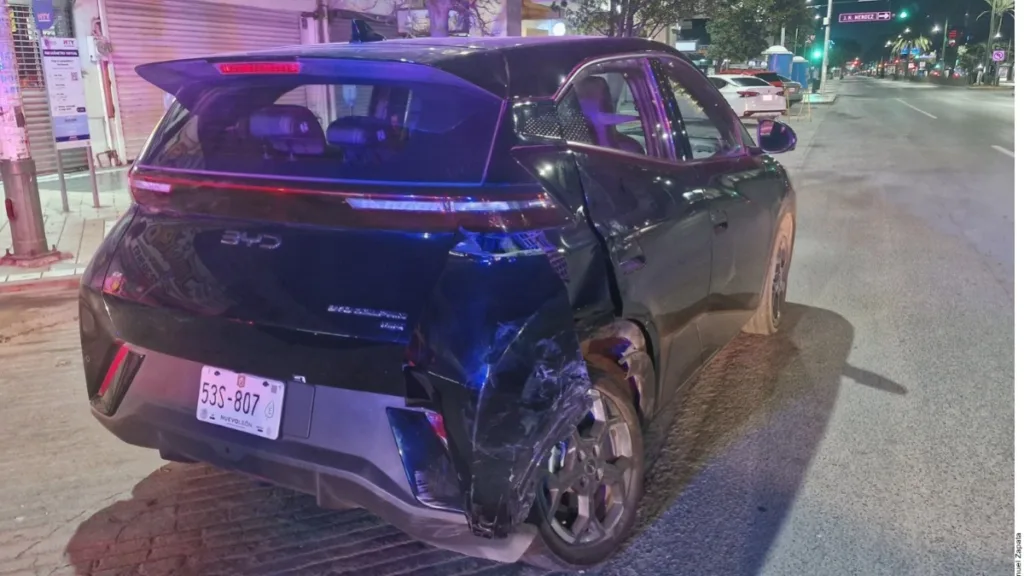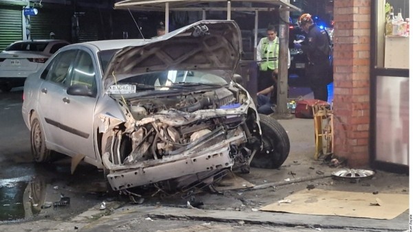 En este punto el vehículo chocó la parte trasera de un automóvil Dolphin Mini, lo que le hizo dar un medio giro y subir a la banqueta en donde quedó a centímetros de estrellarse contra la fachada de una tienda de conveniencia.