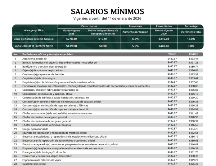 Para 2026, casi todos los salarios profesionales superarán 300 pesos diarios, mientras que en la frontera norte alcanzarán 440.87 pesos, salvo excepciones específicas.