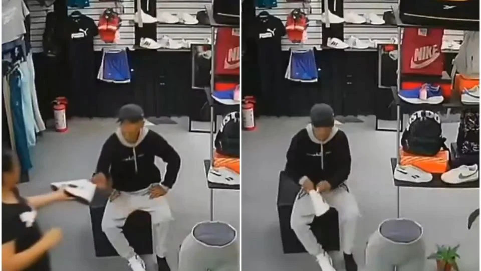 Durante ese instante de distracción, el hombre tomó unos tenis del establecimiento, se los probó y decidió conservarlos sin intención de devolverlos.