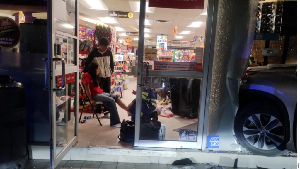 Al estrellarse contra la fachada del negocio, donde buscaba estacionarse, uno de los objetos de la tienda alcanzó la pierna derecha de la cajera.