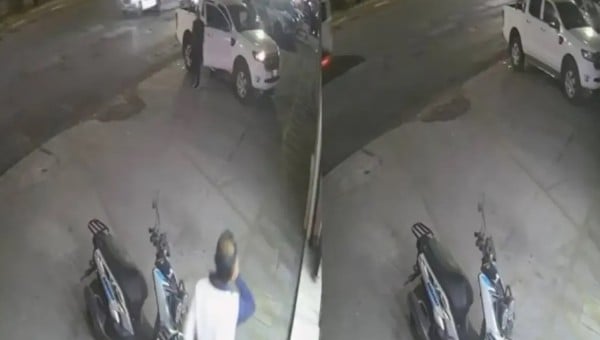 En un video captado por cámaras de seguridad se observa a un hombre caminar por la banqueta aparentemente hablando por teléfono antes de acercarse a las víctimas.